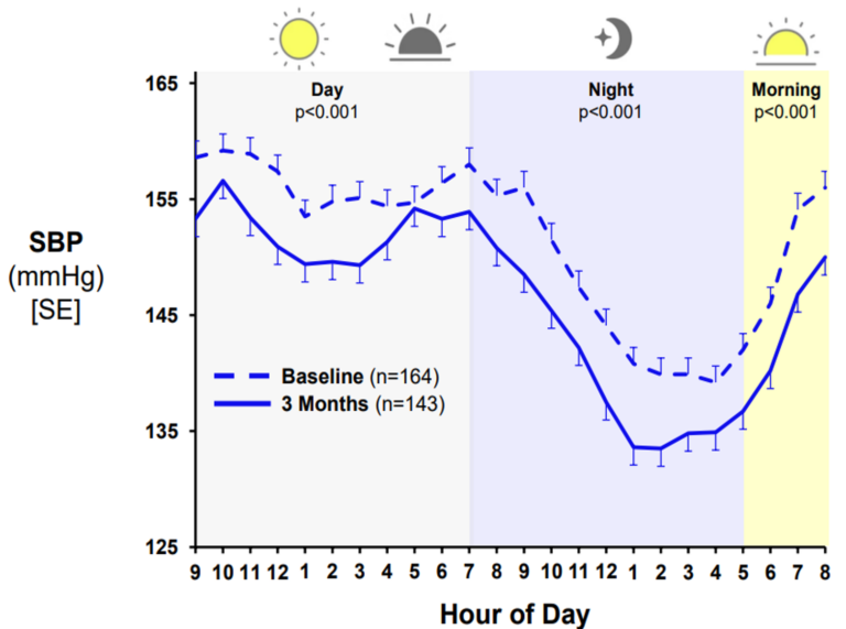 • 24時間の安定: 降圧薬ではコントロールしにくい「早朝高血圧」や「夜間高血圧」にも有効と考えられています(図3)。
